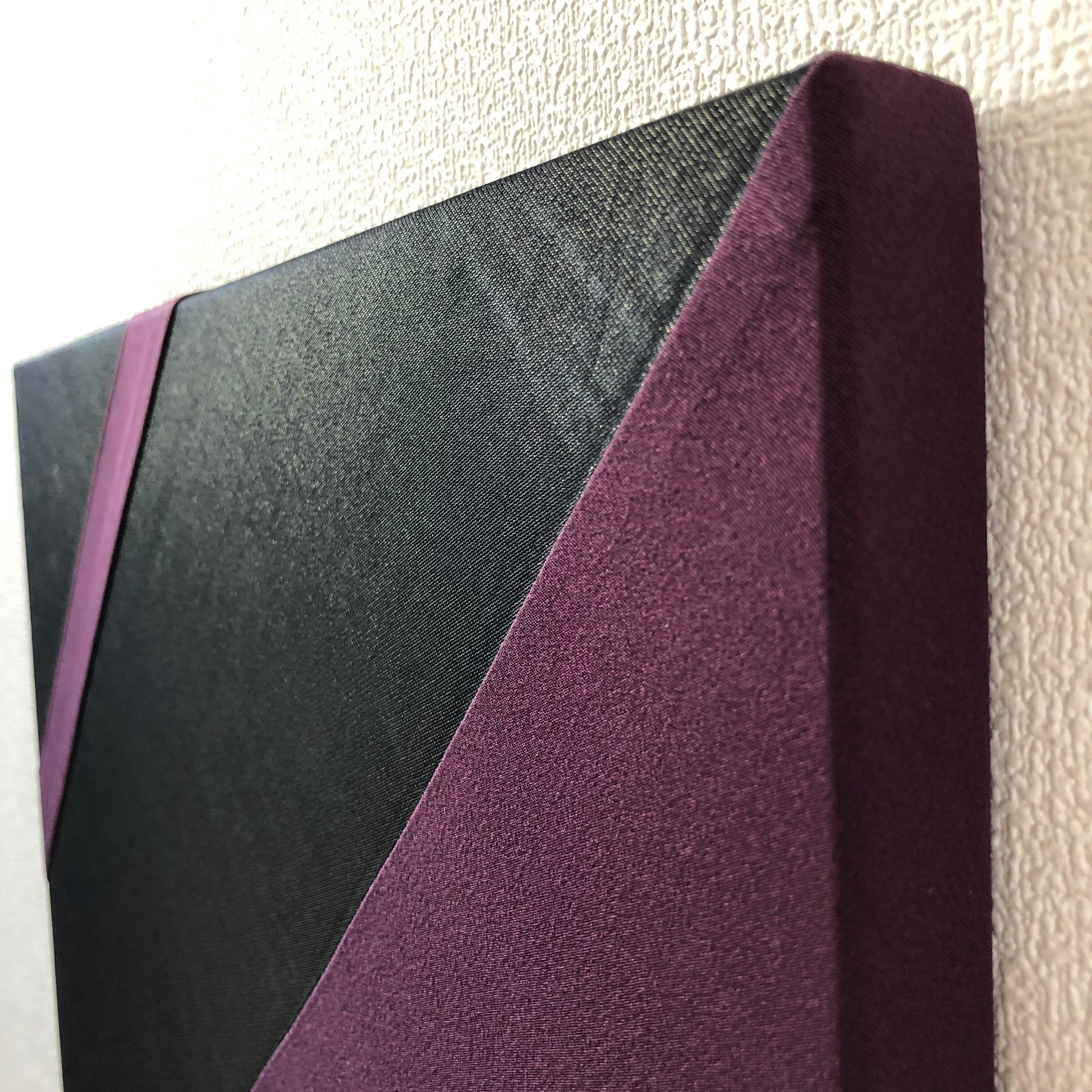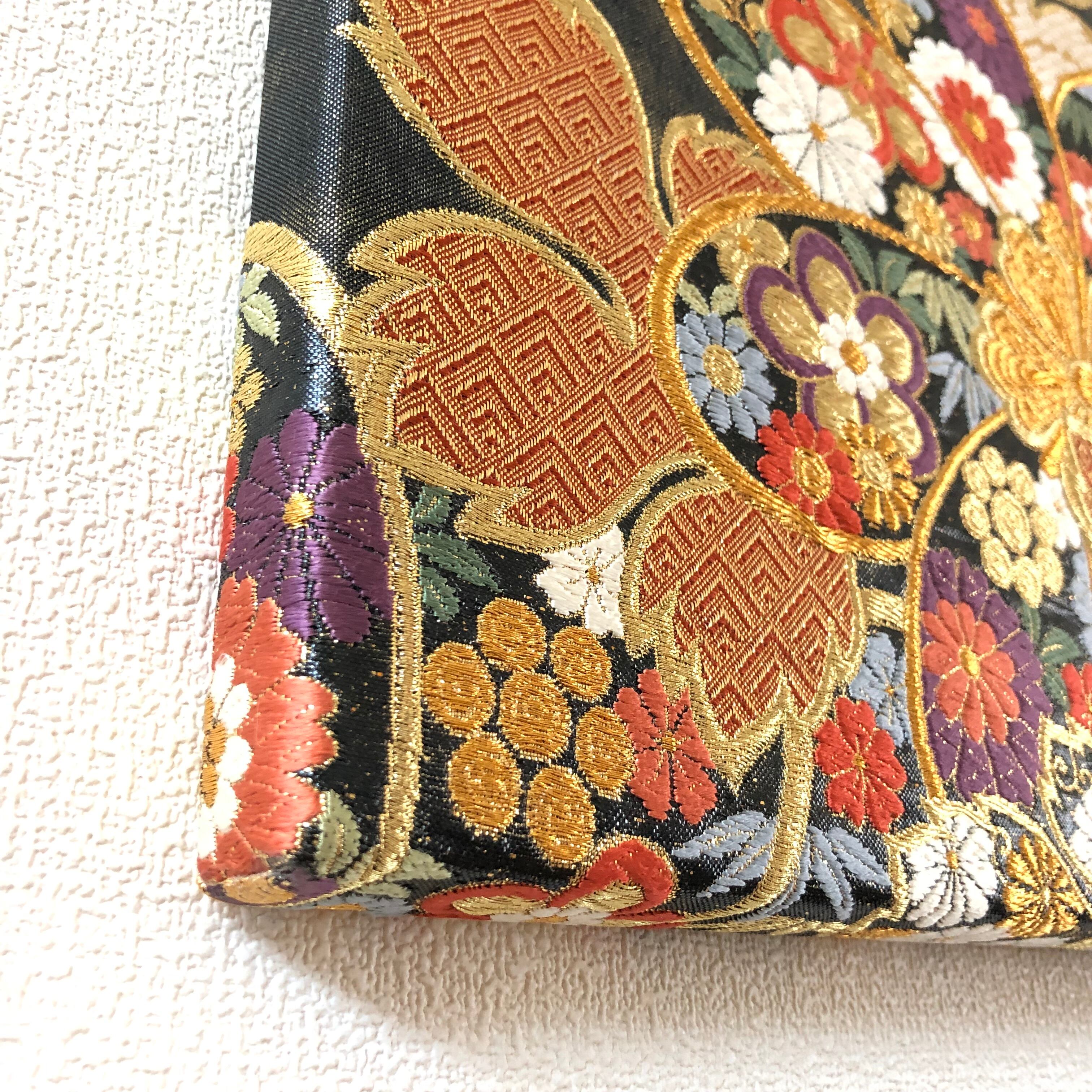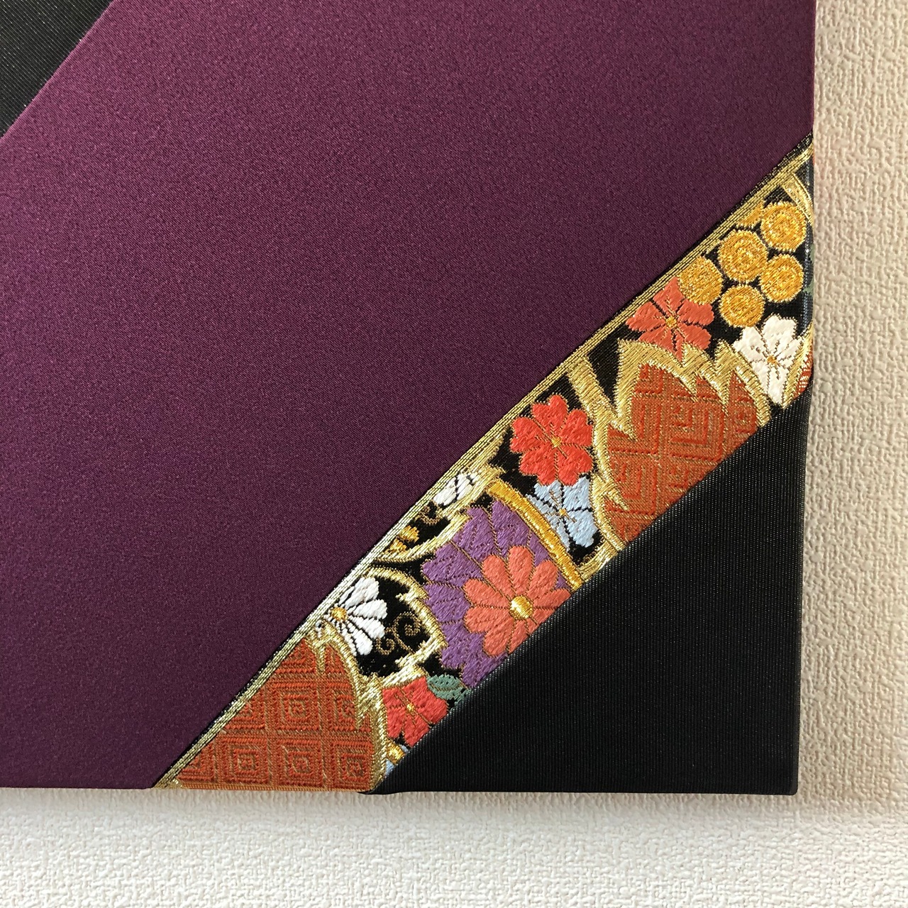 額などは使用せず、ファブリックで直接出来上がっているので、色鮮やかで角度によって見る色が異なる絹の色味とその細やかな刺繍が全面に活かされた商品です。
