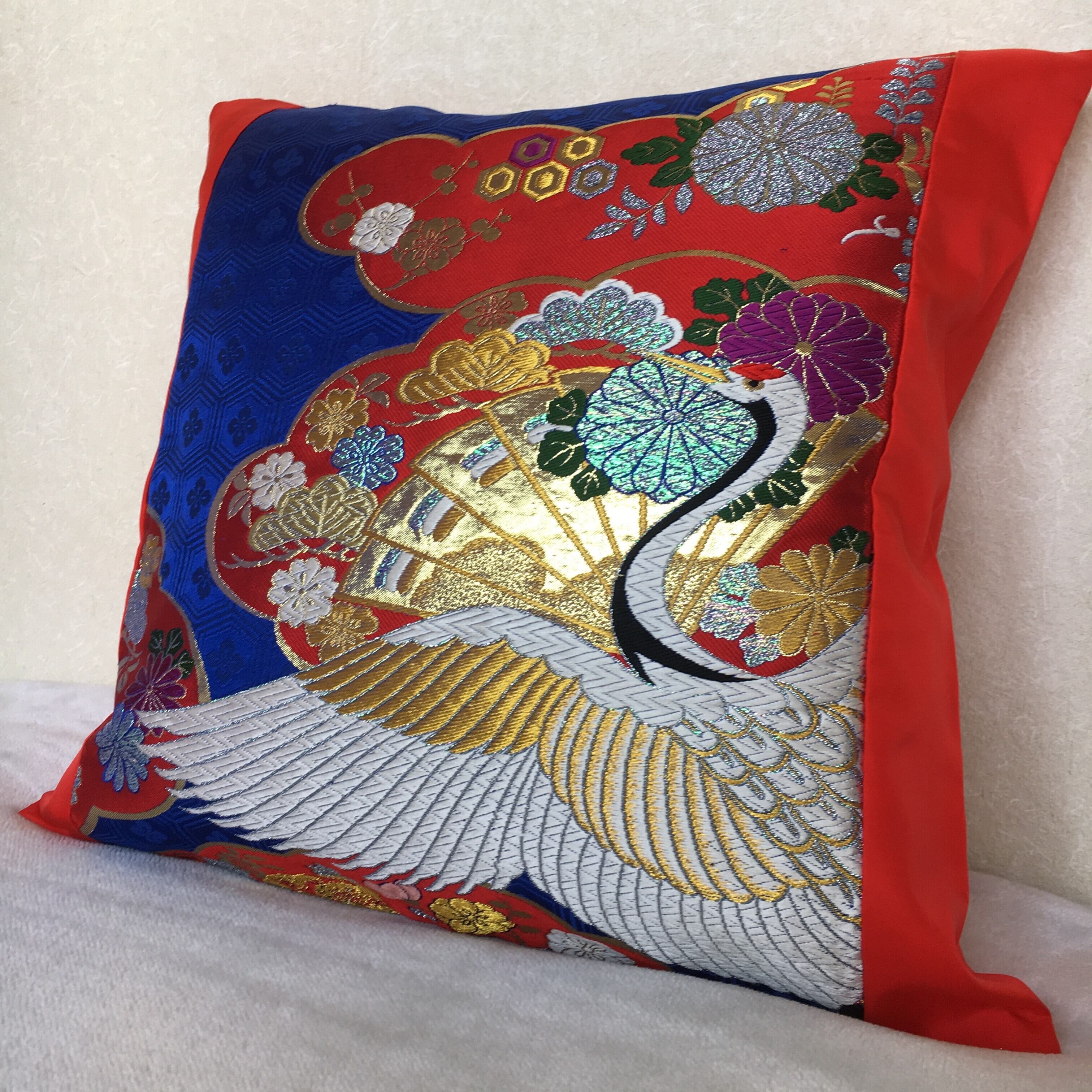 色打掛の生地に単色の挿し色を使って現代風に仕上げたクッションカバーをつくりました。