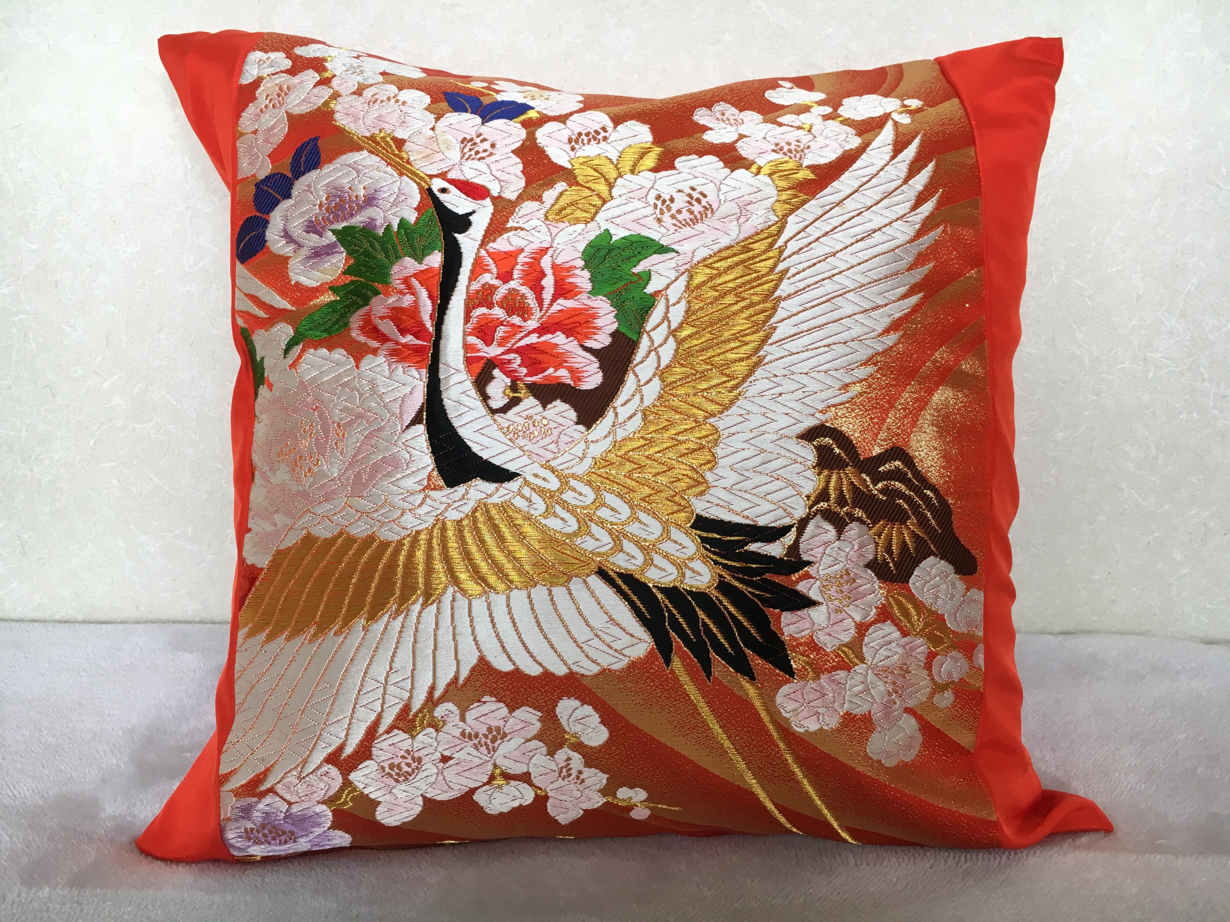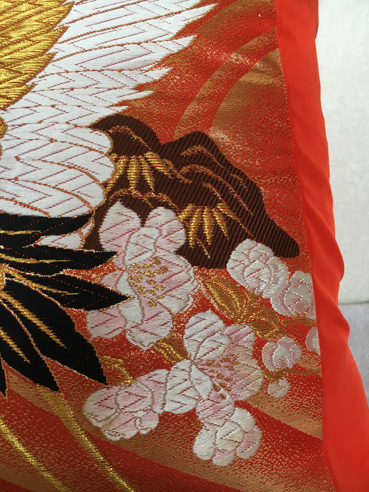 色打掛の生地に単色の挿し色を使って現代風に仕上げたクッションカバーをつくりました。